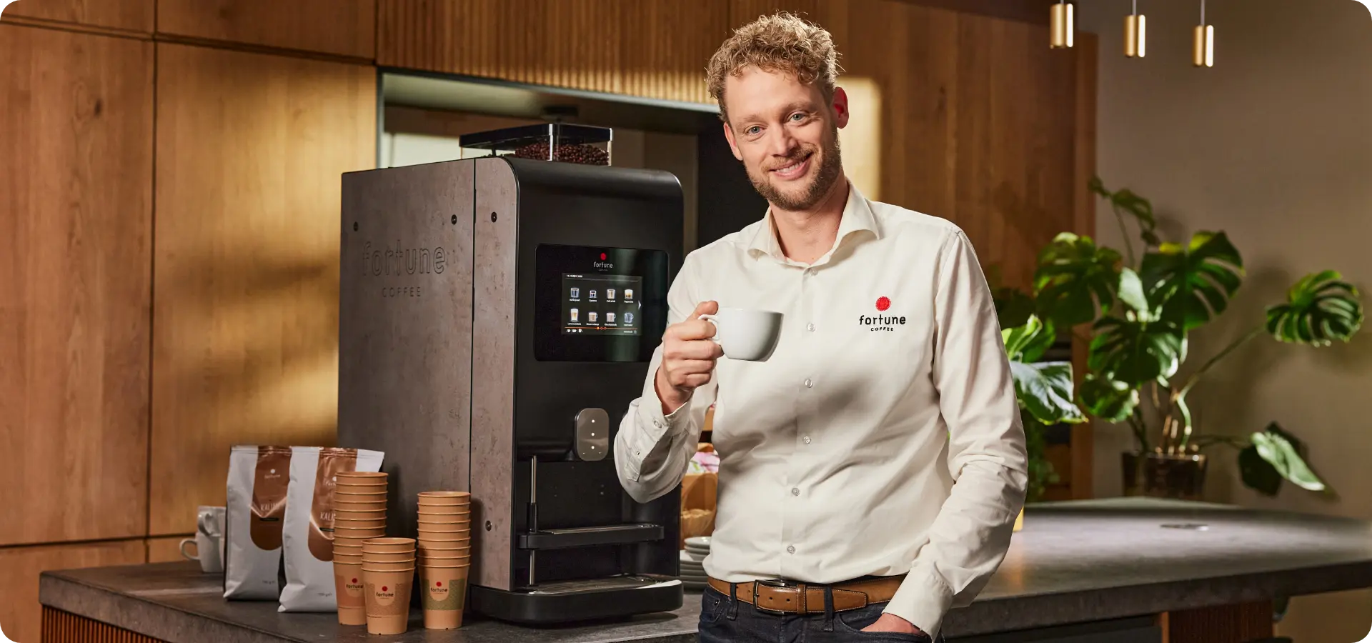Wil jij ook meer koffie op het werk, voor minder? Dan kan dat nu. Vraag jouw regionale Fortune koffieadviseur om informatie over een nieuwe koffieautomaat voor jullie koffiecorner. Hij of zij komt snel langs om je meer te vertellen én je natuurlijk een lekkere kop koffie te laten proeven!