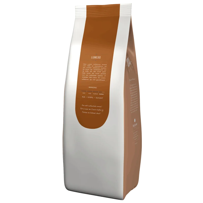 Deze Luwero koffiebonen bestaan voor 100% uit Arabicabonen van een constant uitstekende kwaliteit. De bonen zijn donker gebrand wat de koffie zijn rijke smaak geeft van zachte heldere zuren en volle chocolade smaken. Deze bonen zijn vooral geschikt voor een espresso of smakelijke Café Crème.