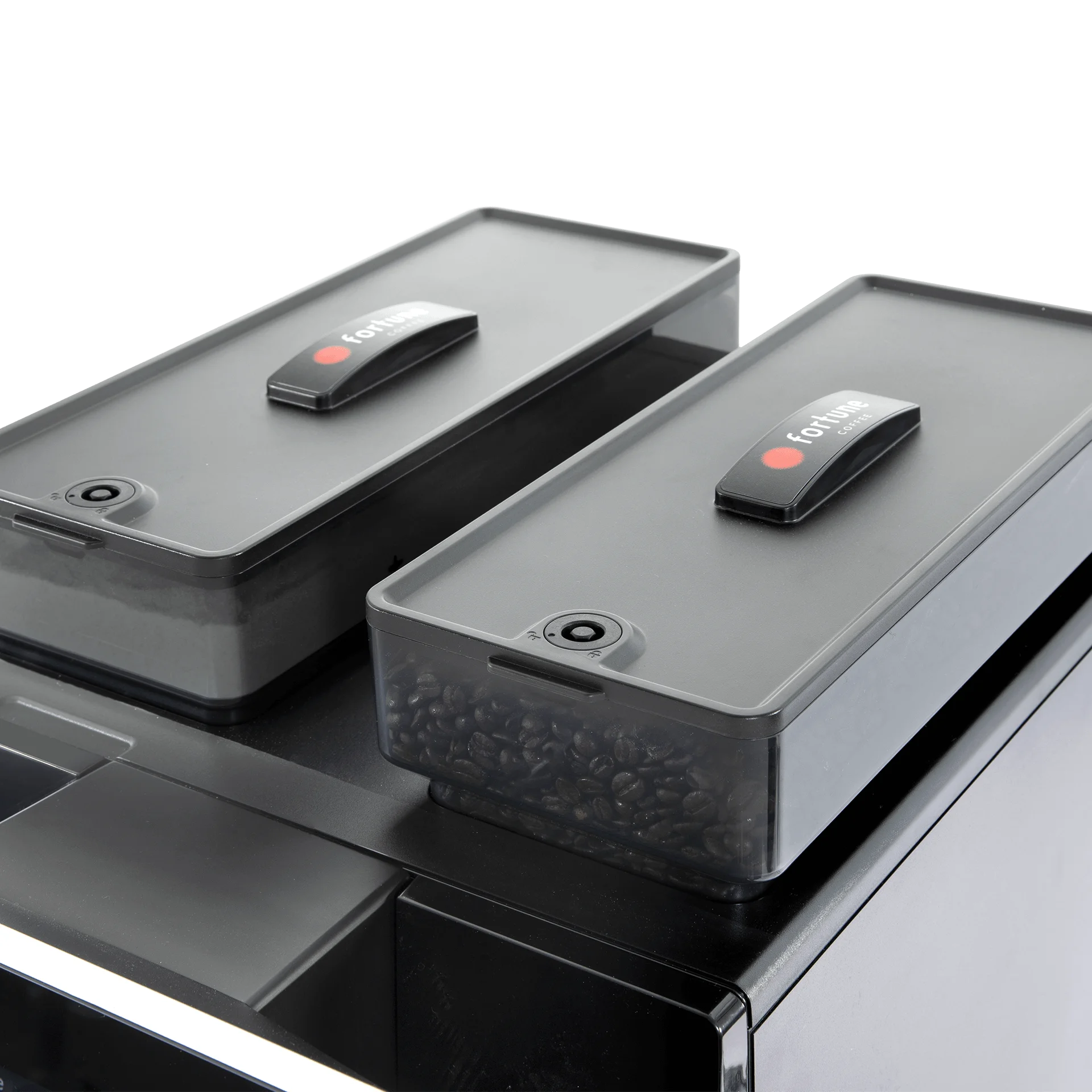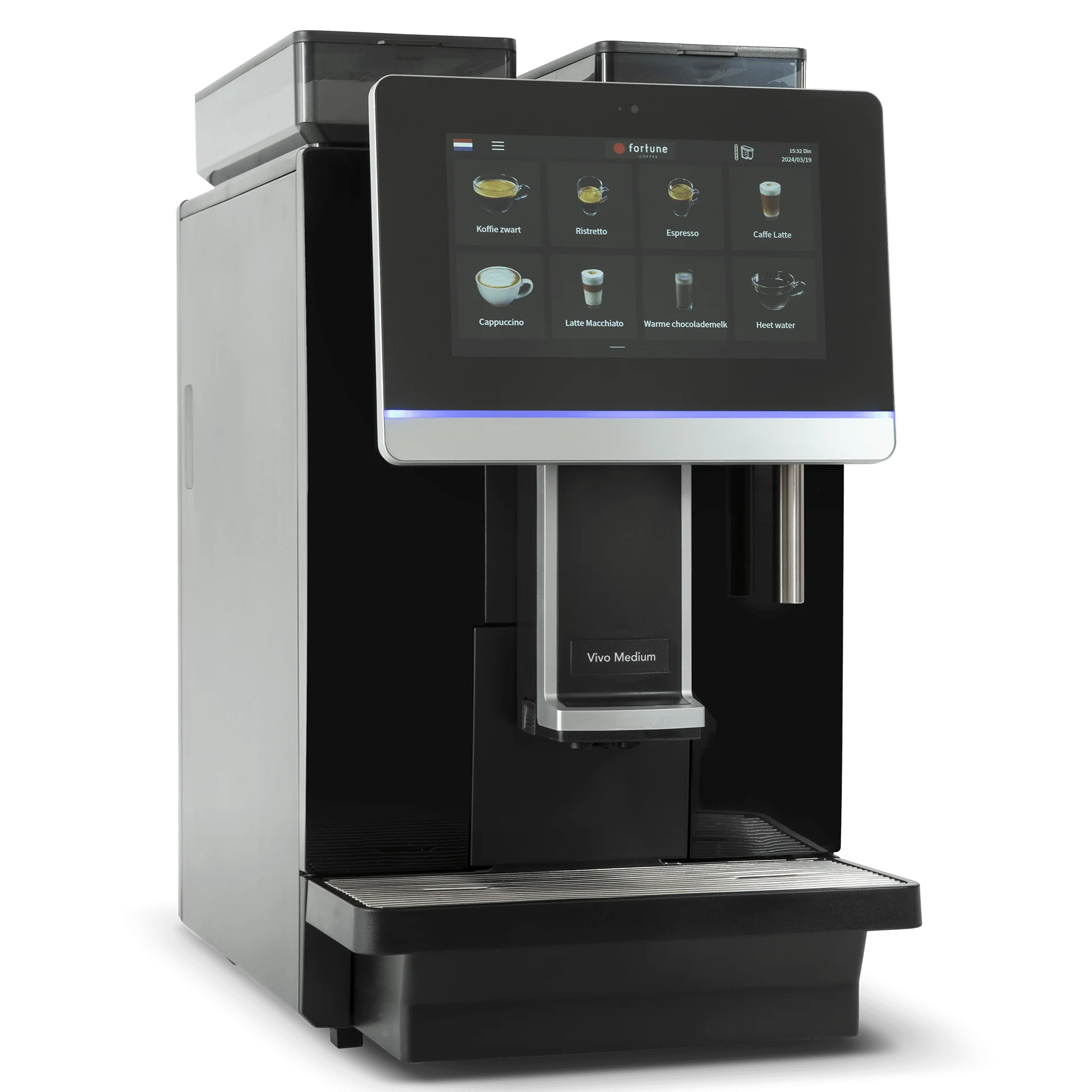 De Vivo Medium 10 inch bonenkoffiemachine heeft 2 containers en meer dan 20 drankopties. Zo heeft iedereen snel zijn favoriete warme drank, van zwarte koffie en espresso tot cappuccino. Ben je benieuwd naar alle mogelijkheden? Jouw Fortune koffieadviseur stelt de koffierecepten in naar jullie wensen.