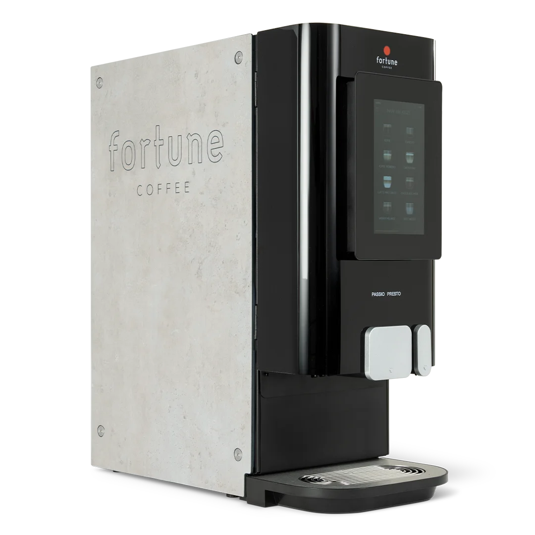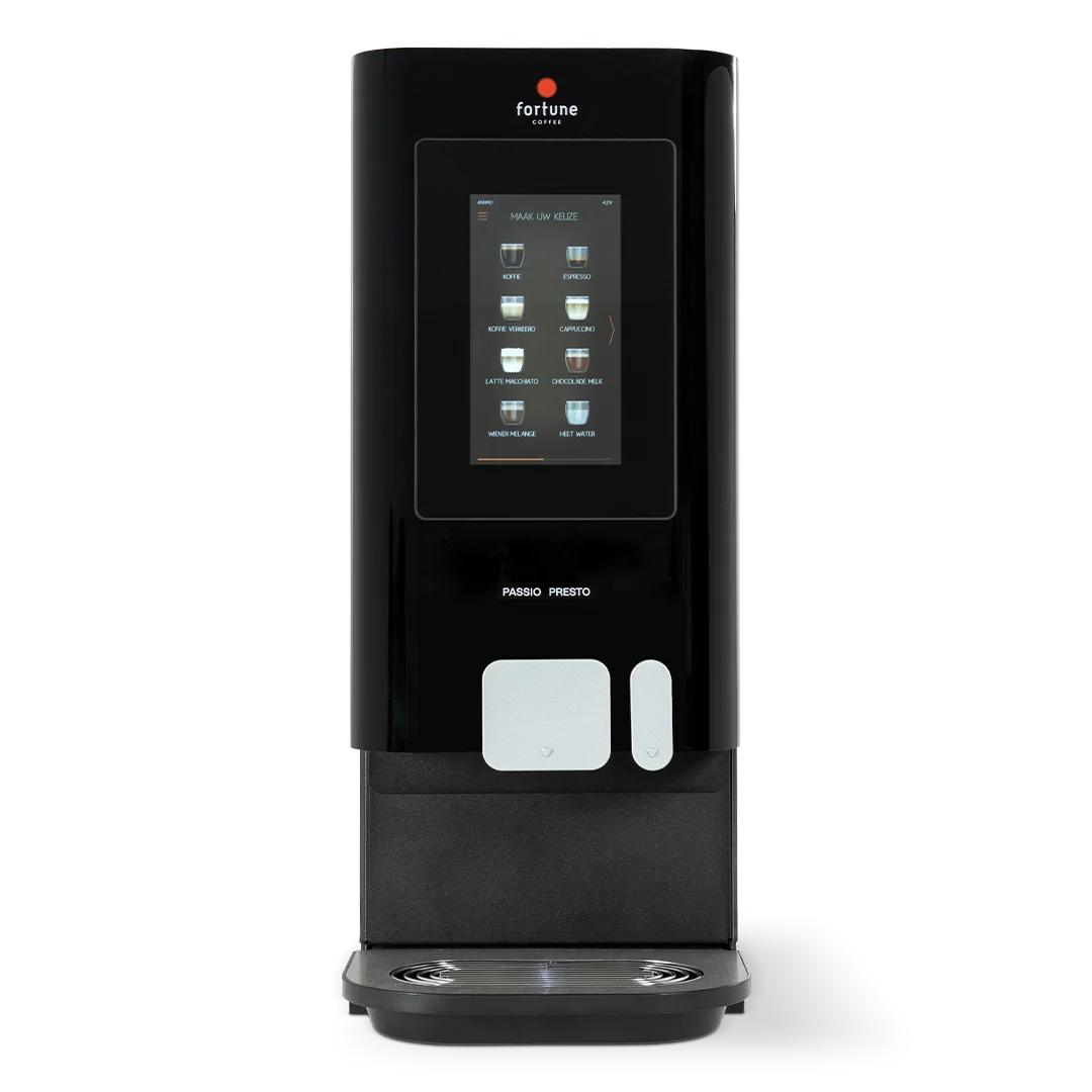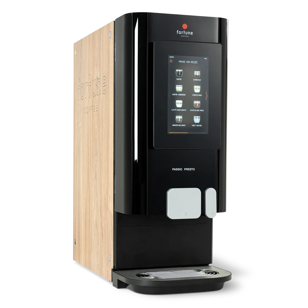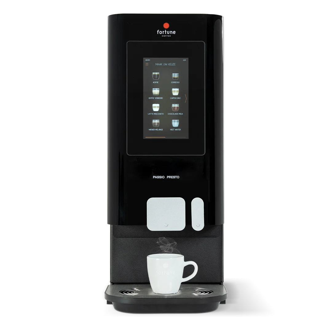 Met de Passio Presto Compact zet je moeiteloos een variatie aan warme dranken. Zoals koffie, espresso, cappuccino, Wiener melange en chocolademelk. Het kan allemaal. Samen met jouw Fortune koffieadviseur stel je de koffierecepten samen die passen bij de gebruikers van jouw koffiecorner.