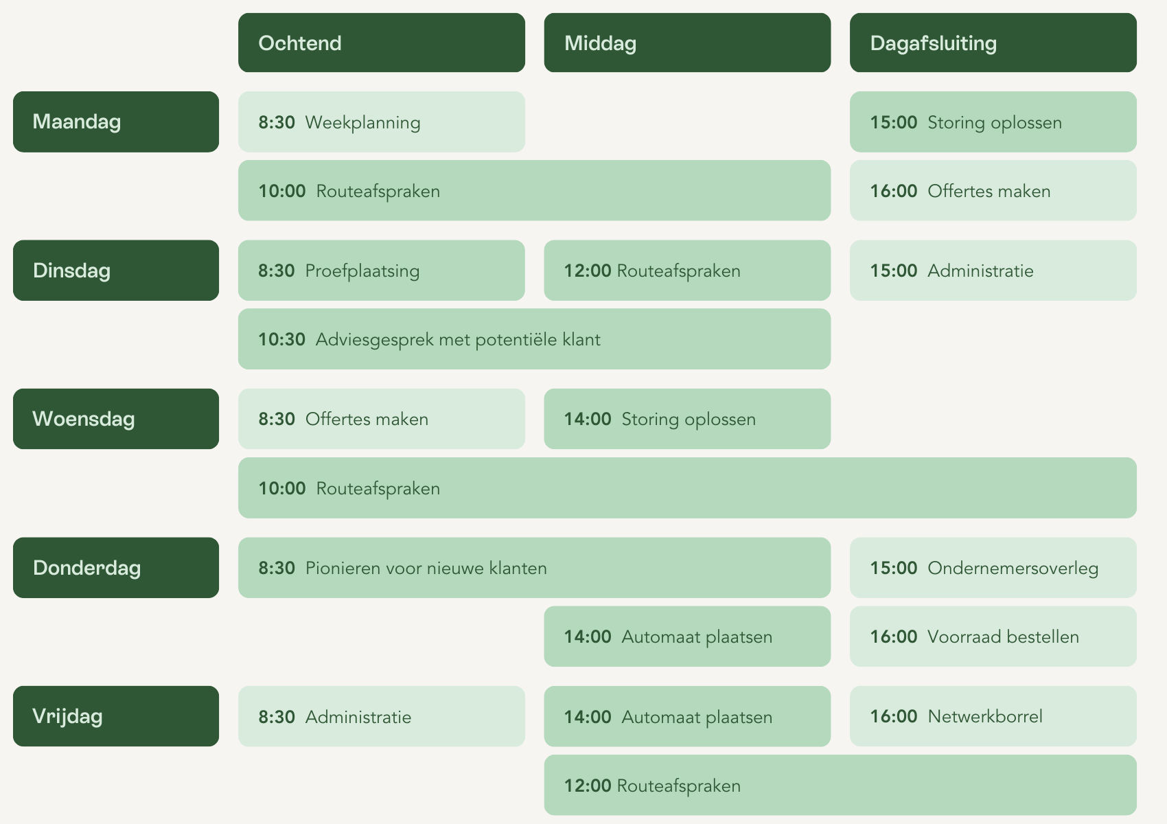 Elke week is anders, maar één ding is zeker: je bent veel onderweg om klanten blij te maken met verse koffie en goede service. Benieuwd hoe jouw week als franchisenemer eruit kan zien? Onderstaande agenda laat zien hoe je onder andere leveringen, onderhoud en klantbezoeken combineert.