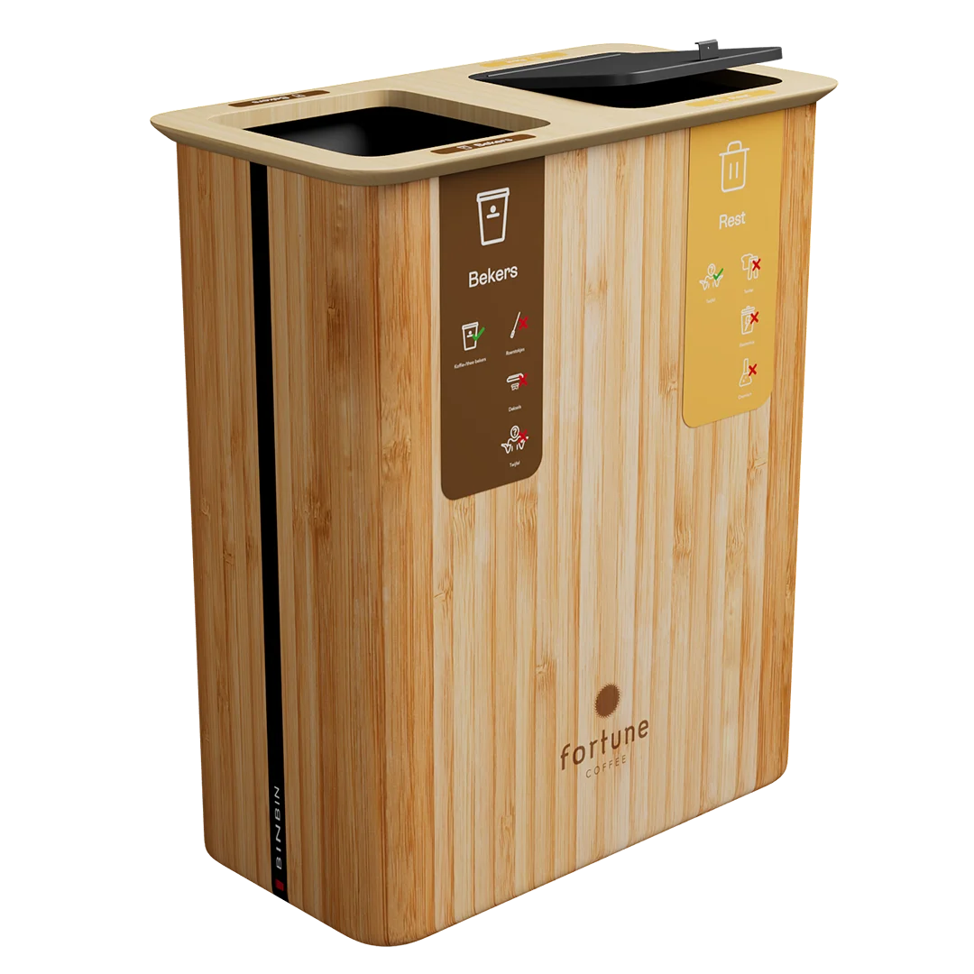 Opgeruimd staat netjes en duurzaam! Want met deze afvalbak met twee vakken is afval scheiden zo gedaan. De prullenbak voor gescheiden afval past in elke binnenruimte. Het ontwerp is strak en modern in wit of zwart met een bamboe ‘hoed’. De afvalscheidingsbak stel je zelf samen: voor welk type afval het gebruikt moet worden en een design als je dat wil. Alles is mogelijk, ook jullie huisstijl. De labels op de afvalbakken zijn magnetisch of plakbaar.