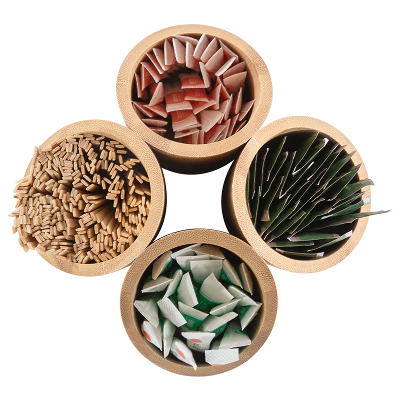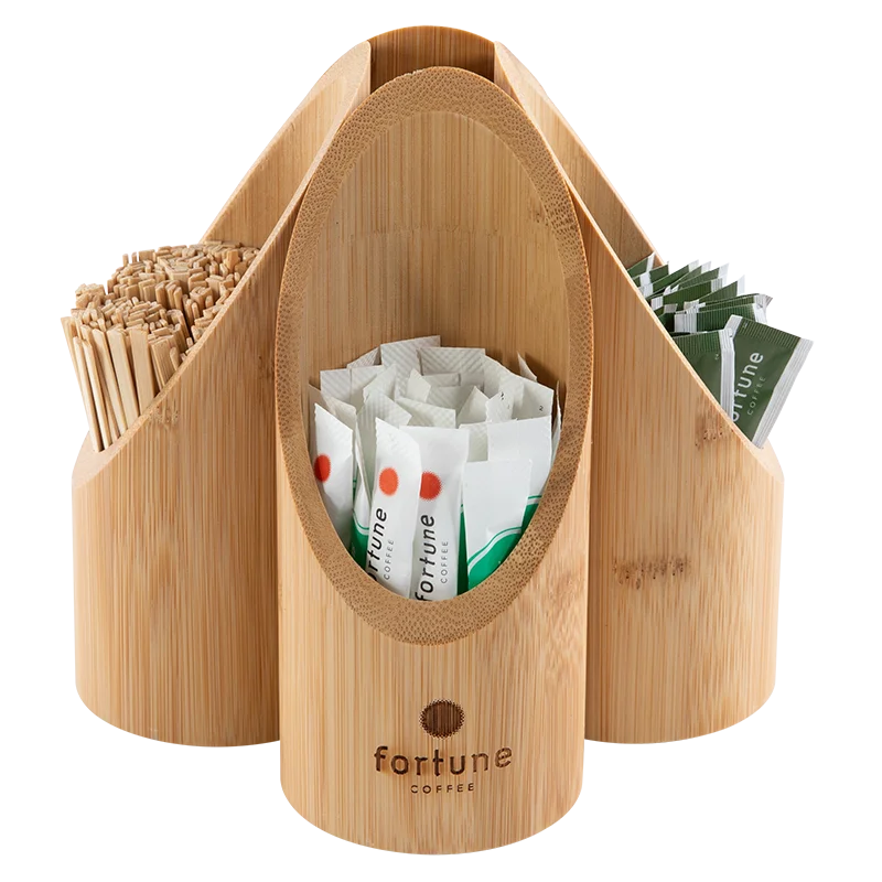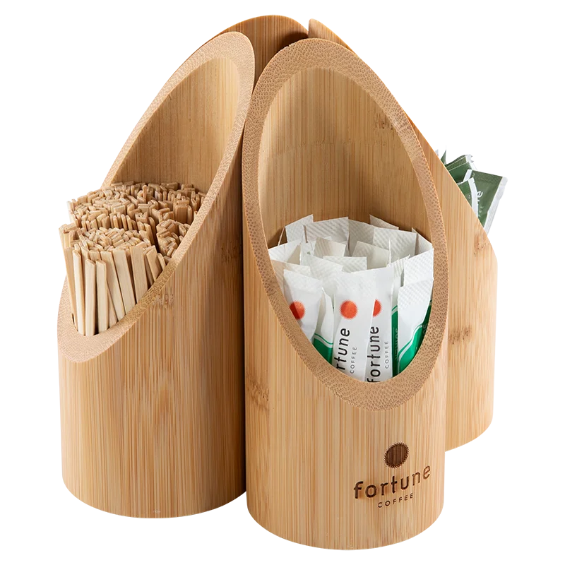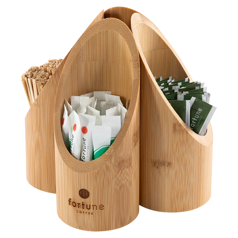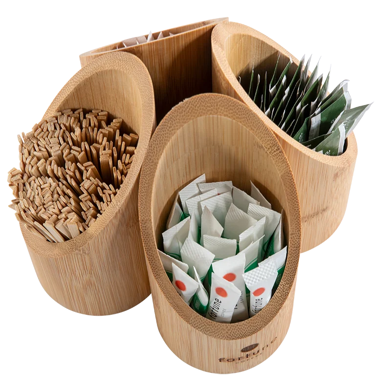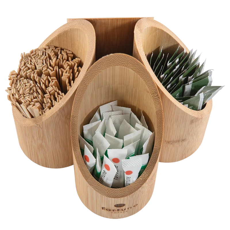 De bamboe dispenser is een aanwinst voor je koffiecorner en vergaderruimte. De dispenser heeft vier vakken met elk een diameter van 6 centimeter. Bewaar daarin bijvoorbeeld suiker-, melk- en honingsticks en roerstaafjes. Zo heeft iedereen zijn favoriete ingrediënten bij de hand en drink je je koffie altijd precies zoals jij dat wilt. Dankzij het stijlvolle design past de dispenser in elke ruimte. En je zult zien dat de koffiecorner nog nooit zo opgeruimd was.