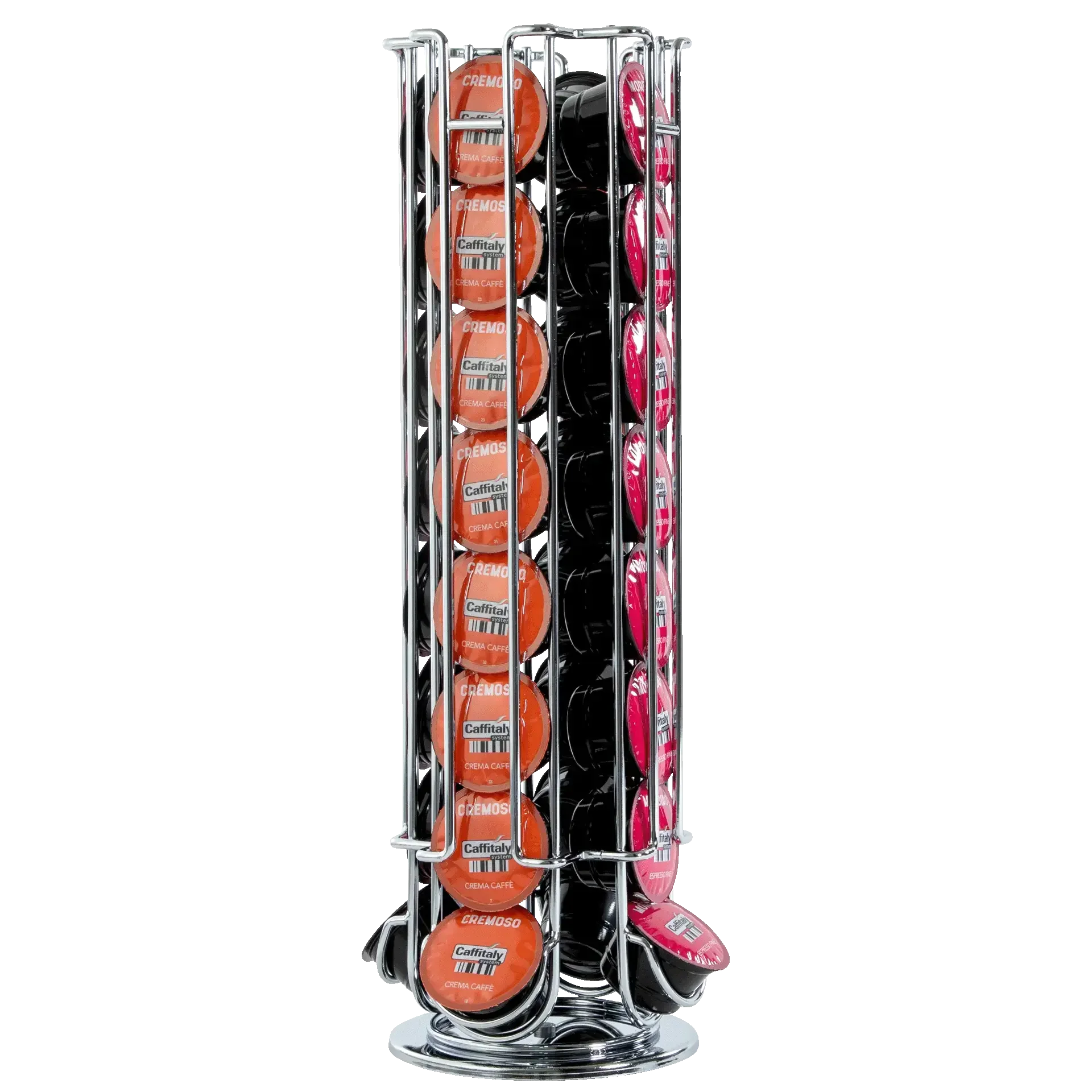 Voor deze draaibare koffiecuphouder voor koffiecups is er altijd plek! Het design is smal en strak en biedt toch genoeg ruimte voor 32 koffiecupjes. Deze koffiecuphouder van RVS staat mooi in elke koffiecorner en is een handige aanvulling naast de Modesto capsuleautomaat! De capsulehouder, of cuphouder, heeft ruimte voor 8 koffiecups of -capsules aan elke kant. Het vullen gaat gemakkelijk vanaf de bovenzijde. Zowel de Cremoso als de Morbido koffiecapsules passen hier perfect in.
