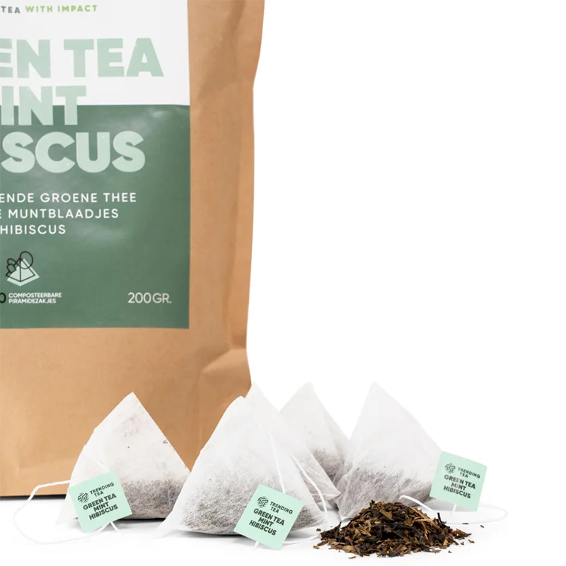 Munt en hibiscus thee van TrendingTea wordt per 100 stuks verpakt. Zo besparen we flink wat verpakkingsmateriaal. En doordat er geen plastic of papier in de theezakjes verwerkt zit, zijn die 100% composteerbaar. Ze kunnen na gebruik dus zo bij het GFT-afval. Makkelijk en duurzaam.
