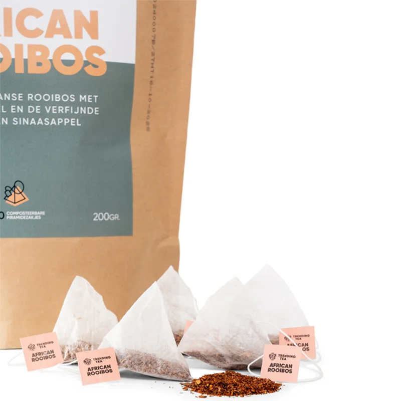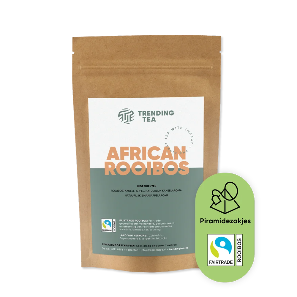De African Rooibos thee van TrendingTea is Fairtrade. De piramidetheezakjes zijn 100% composteerbaar, plasticvrij en mogen bij het gft-afval. De thee is verpakt in een grootverpakking wat zorgt voor minder onnodig verpakkingsmateriaal.